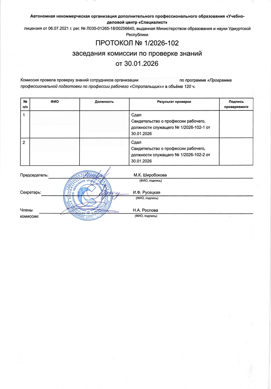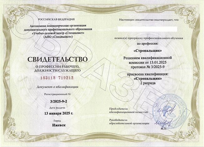 Онлайн-обучение по профессии Стропальщик построено на изучении учебных материалов с последующим итоговым тестированием. При его прохождении обучающийся получает комплект официальных документов: свидетельство о профессии рабочего с указанием присвоенного разряда – от 2 до 6-го, удостоверение о присвоении квалификации и протокол проверки знаний